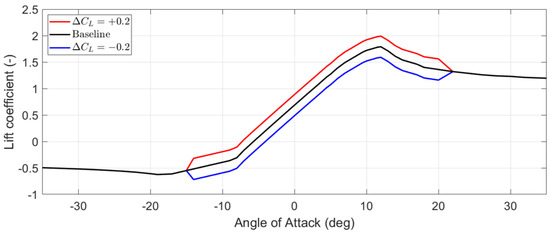 The Gurney flap and the plasma actuator work together as a lift actuator, which allows a sectional lift coefficient change () between and with respect to the baseline lift coefficient at a given angle of attack range. The lift actuator is assumed to be effective from degrees to 20 degrees angle of attack. Figure 1 shows the baseline and actuated lift coefficient for the blade section.
