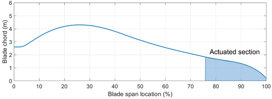 A single lift actuator is mounted on each blade of the turbine. The aerodynamic properties of the actuated sections are modified according to the actuator commands. Figure 2 shows the blade plot with chord length at percentage span locations. The actuated section is shown with the shaded area with a coverage of of the blade length. It starts from the blade span of 47.9 m and extends to the blade tip at 63 m.