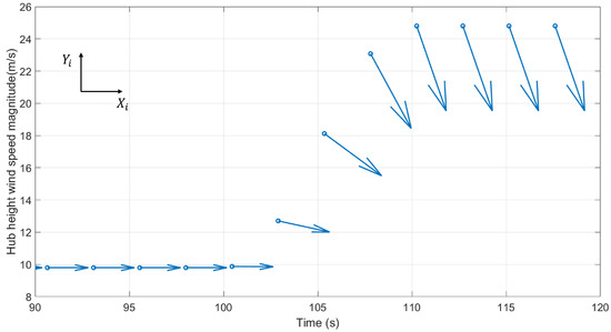 Figure 4 shows a visualization of the ECD for the IEA 3.4A turbine with (rated wind speed). The downwind direction is marked in the figure with . The size and direction of the arrows represent the wind speed magnitudes and directions. The gust wind starts at 100 s and stabilizes at 110 s. Note that the arrows are scaled down by 70% to provide a better visualization.