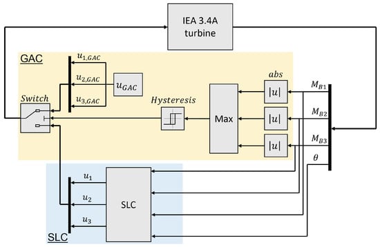 Block diagram of GAC and SLC with hysteresis switching logic commanded by maximum absolute values of flapwise bending moments. SLC from [9].
