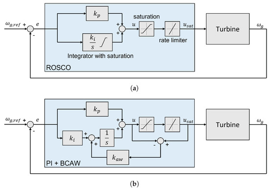 Figure 7b shows the block diagram of the PI controller with BCAW. This configuration is implemented in both pitch and torque PI controllers. The tracking time constant is chosen to be equal to the integral time constant of each controller, which follows the rule of thumb suggested by [27].