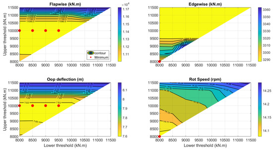 Figure 9 shows the contour plots for the primary evaluation criteria. Each contour plot shows the changes in the maximum transient value with respect to the thresholds. The maximum transient value is found within the 20 s window after the gust impinges on the rotor (100 to 120 s). The colorbars are shown to the right of the contour plots. Lighter color in the plot represents a lower peak value, which is favorable. The regions in yellow contain the best thresholds. The minimum peak values are marked with red dots for all the contour plots. Since the thresholds have to satisfy , the contour map is in a triangle shape. With all the above considered, the thresholds for this case are from 8000 kN·m to 11,500 kN·m with increment of 500 kN·m. A total of 36 simulations are conducted to generate the contour maps.