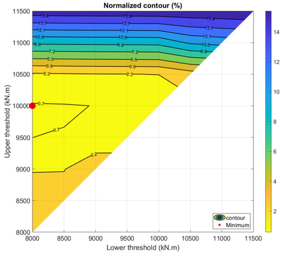 Figure 10 shows the %-change weighted sum contour plot. Theoretically, the optimal combination of the upper and lower thresholds would correspond to a point whose value equals zero, which means the combination has the lowest peak value on all the metrics. However, since the minimum points in each metric are attained with different thresholds, the minimum value under the current settings is , which is shown with a red dot.