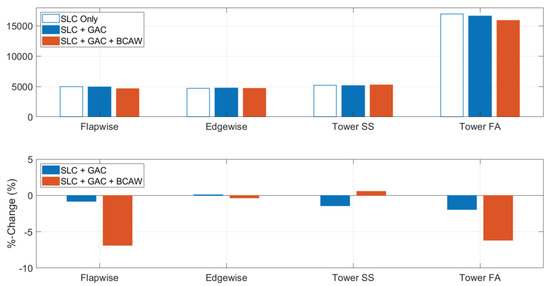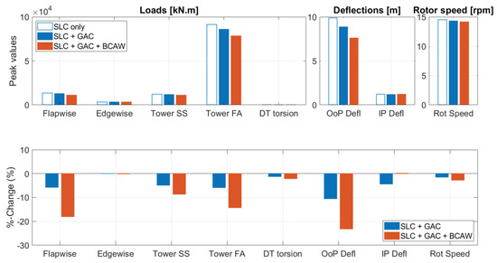 Figure 11 shows the results for all metrics in the evaluation criteria under gust wind. The top plot shows the maximum absolute transient (peak) values. The corresponding percentage changes with respect to ‘SLC only’ case are plotted in the bottom graph.