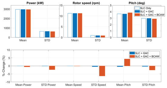 The peak value comparison in the previous section demonstrates extreme load reduction under gust wind conditions. Since the loads can go beyond the threshold in the presence of turbulence as well, the GAC could affect the turbine performance under normal turbulence wind conditions. Therefore, the mean and standard deviation of rotor speed, pitch angle, and generator power are evaluated in this section to ensure that the turbine outputs are not affected by GAC during normal turbine operation.