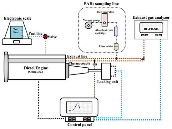 A four-cylinder, indirect-injected Onan DJC diesel engine was tested at different engine loads from idle to 9 kW under a constant engine speed (@1800 rpm). Table 1 shows specifications of the engine, along with the experimental test setup, including PAH sampling (as shown in Figure 1). No modifications to the engine were performed other than the inclusion of an auxiliary fuel tank for the test fuels. The fuel mass consumption was measured by comparison of the mass of fuel before and after each 20-min trial for the fuel at each engine load. The fuels used in this study included standard diesel (No. 2) and high-carbon alcohols (n-propanol (CAS No:71-23-8), n-butanol (CAS No:71-36-3) and n-pentanol (CAS No:71-41-0), which were obtained from Merck. Nine different mixtures named DPro, DBu and DPen were formed with 5%, 20% and 35% mixing ratios of high-carbon alcohols. Select fuel properties for each test fuel are listed in Table 2. Engine emissions were determined using a 5-gas analyzer (Model: EMS 5002-5) for which measurement ranges and resolutions of HC, CO and NO are given in Table 3. For experimental confidence and repeatability, tests were repeated three times for each experimental sample according to the ISO 8178-6:2018 standard.