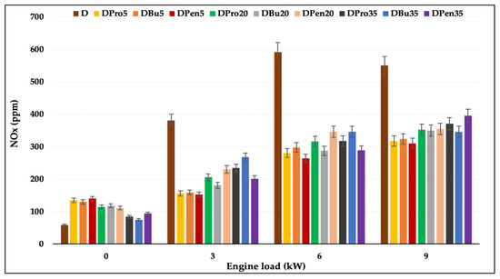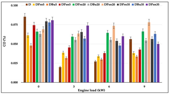 As shown in Figure 3, while the CO emissions produced by diesel fuel was high in the no-load condition, it had a decreasing trend with higher loads. The main reason for the presence of CO among combustion products is the result of incomplete combustion with insufficient oxygen [45,46]. When considering the entire combustion chamber, oxygen may be insufficient in general, and if the mixture is not completely homogeneous, local excess oxygen in a certain location of the combustion chamber may cause the flame to die out and not fully complete combustion [46]. Thus, when higher alcohols were added to diesel fuel (except DBu5), an increase was observed in the average CO emission of all mixtures. This increase is listed as DBu < DPro < DPen from least to most. As compared to diesel, an increase of 79.68%, 66.01% and 93.35% was recorded in the mixtures of DPro35, DBu35 and DPen35, respectively. With higher alcohol concentrations, a significant increase in CO emissions was observed because of low in-cylinder temperatures and rapid flame extinction [26,27]. Additionally, the presence of higher alcohols in the fuel promotes a higher ignition delay and creates fuel-rich zones in the cylinder, which lead to higher CO formation [20,21]. However, slight reductions occurred due to the increase in the conversion rate of CO to CO2 in the DBu5 mixture. Therefore, in general, the use of low-rate high-carbon alcohol with diesel fuel can be considered as a method to reduce CO emissions in the literature [23,24,28].