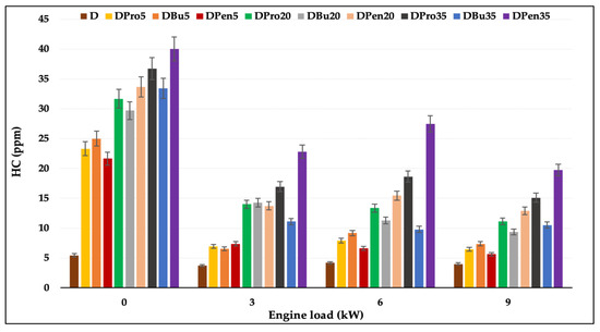 HC formation is a result of incomplete combustion [47]. Engine design, operating conditions, injection characteristics, fuel properties and air/fuel ratio are the main parameters that govern incomplete combustion [47,48]. Similar to CO emissions, emissions of HC were found to be lower than those of binary mixtures, as shown in Figure 4. Depending on the increased oxygen ratio in the cylinder, other factors such as flame extinction, misfires, partial burns and oil absorption in the cylinder may cause HC emissions as a result of incomplete combustion [49,50]. Among the 5% mixtures, HC emissions increased as follows: DPro5 (110.48%) < DPen5 (123.46%) < DBu5 (159.40%). For the 20% concentration volume of the test fuels, HC emissions were produced, least to greatest, as follows: DPro < DBu < DPen. As the alcohol content increased in the mixtures, the increase in HC emission drastically increased. The DBu < DPro < DPen ranking was obtained at a mixing ratio of 35%. These differences between alcohols were the result of the radicals on combustion of each alcohol. The maximum increase was obtained with the DPen35 mixture. This trend can be ascribed to higher LHE and lower cetane numbers of blended fuels [44]. These characteristics create a quenching effect and a wider lean outer-flame zone, both of which cause higher unburned hydrocarbons [42]. Higher HC emissions with respect to higher alcohol content in diesel/alcohol blends is an outcome consistent within the literature [24,28,33].