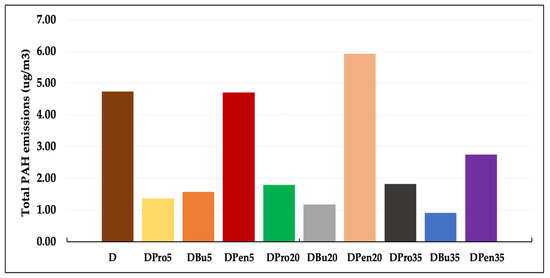 The PAH emission concentration (µg/m3) in the exhaust gas is given in Figure 5, and the total PAH concentrations are tabulated in Table 5. Due to the chemical nature of diesel fuel, it is likely to emit PAH components [51,52]. The total PAH concentration of diesel fuel, mostly naphthalene (two-ring) and phenanthrene (three-ring), was obtained at 4.73 µg/m3. When Figure 5 is viewed in terms of diesel, it is clearly seen that diesel leads to significantly higher PAH emissions compared to binary blends. When n-pentanol, n-butanol and n-propanol were added to diesel, significant reductions were obtained in the total PAH emissions of all blends (except DPen20). With the addition of alcohol, the total concentration of high-ring aromatic compounds also decreased. The order of this reduction is DPro5 (71.20%) > DBu5 (66.86%) > DPen5 (0.59%) in the 5% mixtures. Among these mixtures, 5% n-pentanol addition resulted in a slight decrease, while an increase was observed in the 20% mixture, which may be caused by the higher cetane number and chemical kinetics of pentanol. On the other hand, in the 35% mixture, the PAH emission reduction order was determined as DBu (80.98%) > DPro (61.50%) > DPen (42.02%). The LHE effect of alcohols and the cooling effect of the -OH group caused a decrease in the PAH formation reaction mechanism, which reduced total PAH emissions [53]. It has been determined that the addition of alcohol in a high mixing ratio is effective in reducing the most harmful NOx emissions, as well as the total PAH emission concentration in a similar way [54]. The addition of alcohol in a high mixing ratio also has the effect of increasing the durability of the diesel engine, thanks to its potential to prevent wet stacking [39,51].