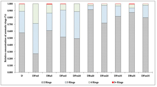 Distribution of PAHs is as equally important as the total PAH formation in exhaust gas [52,55]. An increase in the number of aromatic compounds with higher rings also increases the polluting and harmful effects of PAHs. Therefore, it is vital to reduce PAH compounds with five or more rings. Of the 17 PAHs identified as primary by the EPA, 14 were detected in these experimental studies. The remaining three compounds fell below the detection limit and are given in Table 5. Figure 6 shows the number of aromatic rings and the relative distribution of PAHs of the test fuels. The distribution of PAH emissions with diesel fuel was 57.8%, 31.3%, 10.6% and 0.3%, and consisted of two, three, four, and five aromatic rings, respectively. According to Figure 6 and Table 5, the PAH distribution of all test fuels is higher for the two- and three-ring aromatic components. The highest rates in the distribution of two-ring aromatics were determined as 61% (DBu5), 91.5% (DBu20) and 87.4% (DBu35) in n-butanol mixtures, respectively. High levels of low-ring PAHs may be due to the number of blended fuels pyrolyzed from incomplete combustion due to the addition of alcohol [53,54]. In the three-ring distribution, the lowest distribution was obtained in n-butanol mixtures. Considering the four-ring distribution, the smallest level of distribution was obtained in the n-pentanol mixtures: 8.8% (DPen5), 2.3% (DPen20) and 2.2% (DPen35), respectively. Differences existed among the alcohols for the five-ring distribution. Five-ring aromatics were not detected in the mixtures of DPr05, DPro20, DPen20 and DPen35. However, the percentage of five-ring aromatic distribution among the other mixtures was obtained as 0.8% (DBu5), 0.3% (DPen5), 0.1% (DBu20), 0.1% (DPro35) and 0.5% (DBu35). The formation of five-ring aromatics can be ascribed to the ignition delay of alcohols in this ratio, depending on the cetane number and the inability of alcohol radicals to suppress formation in the final stage of combustion. Minimizing PAHs with higher rings in the PAH distribution prevents total PAH formation that could cause diesel engine failure such as wet stacking [40,56]. Thus, blended fuels without five-ring aromatic compounds minimize the production of higher PAHs, making blended fuels superior to diesel in terms of possible engine failures and carcinogenic effects.