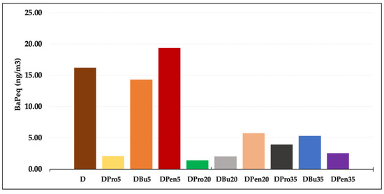 Together with the total PAH formation and distribution, the toxic effect of PAHs on human and environmental health should also be examined [56,57]. The total carcinogenicity of PAHs is defined as a toxic equivalent factor (TEF) value, and the weighted benzo[a]pyrene equivalent (BaPeq) of each PAH compound was calculated based on the TEF [58]. The toxicity distribution of PAH emissions is shown in Figure 7 and the toxicity BaPeq concentration in exhaust gas is given in Table 6. Due to the chemical structure of the diesel fuel, 16.20 BaPeq ng/m3 toxicity occurred on the basis of the TEF. The addition of high-carbon alcohol to diesel resulted in an increase in toxicity values, depending on the amount of high-ring aromatic compounds [59]. When toxicities of 5% blends are compared with diesel fuel, a decrease of 87.27% and 11.66% was observed in the DPro5 and DBu5 blends, while an increase of 19.39% was observed in the DPen5 blend. This is because five-ring benzo[a]pyrene, four-ring benzo[a]anthracene and benzo[k]fluoranthene have the highest values in DPen5 with 13.803, 1.249,and 0.207 BaPeq (ng/m3) concentrations, respectively. n-pentanol chemical kinetics may have caused an increase in PAHs due to the incomplete reaction of various radicals [50,52,57]. Among the 20% mixtures, the smallest toxicity value was obtained in DPro20 with 1.42 BaPeq (ng/m3). Additionally, no high-ring PAH was detected in DPro20, except for four-ring Chrysene (0.007 BaPeq). The order of the maximum reduction in toxicity in the 20% mixtures is DPro (91.23%) > DBu (87.53%) > DPen (64.49%). In the mixture ratio of 35%, the order was determined as DPen (84.34%) > DPro (75.81%) > DBu (67.29%). These reductions were due to the very low PAH level affecting BaPeq in high alcohol mixtures of 20% and 35% and the chemical composition of the mixtures. In general, the alcohol mixing ratio, together with other fuel properties (e.g., density, viscosity and cetane number), can directly affect the amount of high-molecular PAHs that form at the end of combustion [59,60]. All these factors directly contributed to the amount of toxicity reduction among the mixtures. As a result, although all eight blends reduced toxicity compared to diesel, the negative impacts of other fuel properties on emissions should not be ignored with increased alcohol blend ratios.