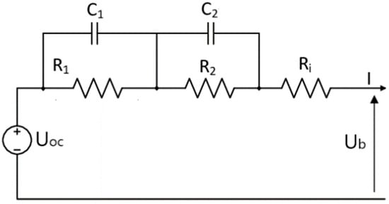 However, to reliably determine the SoC of the battery, it is necessary to extend the basic ECM with another RC circuit []. The electrolyte inside the battery separates the battery’s electrodes, prevents short circuit, and allows ion flow between the electrodes. The properties of the electrolyte degrade over time, so the electrolyte particles eventually bind to the anode and form a second layer called the solid electrolyte interphase (SEI). As the battery ages, the impact of SEI on battery performance and dynamic behavior becomes more apparent. The basic ECM is extended by an additional RC circuit that models this influence (see Figure 1). The time constant R1C1 influences the transfer function of the extended ECM model; however, it was not investigated how this constant, by itself, affects the SoC. This influence will be determined in the continuation of the research.