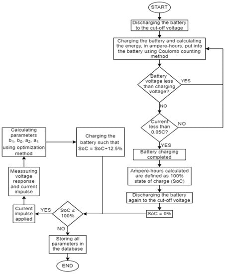 The learning algorithm is shown in the flowchart in Figure 2. Measurements of the voltage response to a small current pulse were made at the values of stored energy corresponding to the following SoC (%) values: [0, 12.5, 25.0, 37.5, 50.0, 62.5, 75.0, 87.5, 100].