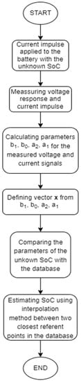 The process of SoC estimation consists of three phases: (i) measurements of the voltage response to the current pulse at the studied SoC, (ii) estimation of the vector x = [UOC K z p] in the same way as in the learning processes, and (iii) localization of the point in hyperspace determined by the test vector. The process of estimating the unknown SoC is represented by the flowchart in the Figure 8.