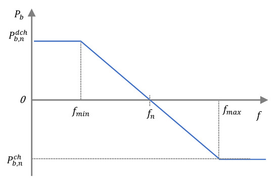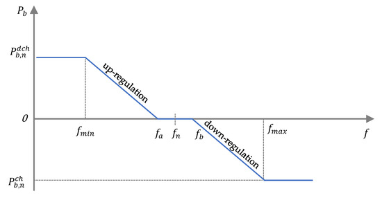 To keep the frequency deviation within admissible ranges, the charge and discharge of the battery can be controlled for the primary frequency regulation service. The regulation action of the storage device, which is shown in Figure 2, requires that the BESS be charged/discharged (absorbing/injecting power to the network) when frequency deviation exceeds the dead band [fa, fb]. The values of frequency requiring regulation are those lower than fa, where BESS is required to be discharged (i.e., up-regulation), and those greater than fb, where BESS is required to be charged (i.e., down-regulation). Regarding the rate at which the BESS has to be discharged and charged, it is required that the power be linearly increasing with frequency for values greater than fmin and lower than fmax and assumes its maximum value when the frequency exceeds the range [fmin,fmax].