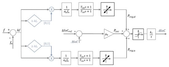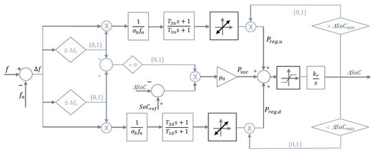 It has to be noted that, to perform down-regulation, SoC must be lower than since, in this case, the BESS is requested to absorb power from the grid whose value depends on the difference between reference and actual frequencies and on the BESS setting droop [20]. Similarly, for the up-regulation, SoC is required to be greater than since the BESS is requested to inject power to the network, whose value again depends on the difference between reference and actual frequencies and on the BESS setting droop, .