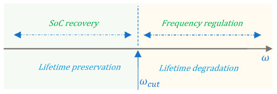 clearly identifies a low-pass filter, whose cut-off frequency is . Thus, the correct evaluation of the proportional gain must comply with a proper frequency bandwidth, which must be large enough to catch frequencies able to meet the requirements of both frequency regulation and SoC recovery. From one hand, highest cut-off frequency values can keep SoC values closest to its reference value by reducing the effect of the disturbance . On the other hand, in the paper, the disturbance is modelled to represent the effect of the battery power required for the regulation service. Thus, this reduction must not be too high, that is a proper value of the cut-off frequency must be assigned. In Figure 8, a schematic of the effect of the choice of the cut-off frequency is shown.