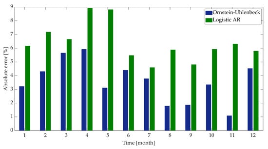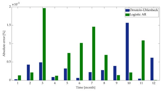 The analysis of Figure 10 and Figure 11 shows that both the processes allow obtaining accurate characterization of the regulation power process. In particular, the Ornstein–Uhlenbeck process generally performs better than the logistic-AR process. Regarding the mean values (Figure 10), both the processes allow us to obtain quite a good estimation of the actual dataset with very low errors. The maximum absolute errors are lower than 1.6·10−3% for the Ornstein-Uhlenbeck and 2·10−3% for the logistic-AR. Regarding the second moment, the Ornstein-Uhlenbeck always has a lower error than that obtained through the logistic-autoregressive. The maximum absolute error of the Ornstein–Uhlenbeck is less than 6% and that of the logistic-AR is less than 9%. The better performance of the Ornstein–Uhlenbeck process is clearly reported in Table 1, where the mean absolute percentage error (MAPE) on the first and second moments of both processes are reported for the whole dataset. In the table, the MAPE is reported also with respect to the processes estimated on weakly and daily basis. In all the cases, the MAPE of Ornstein–Uhlenbeck is lower than the logistic-AR process.