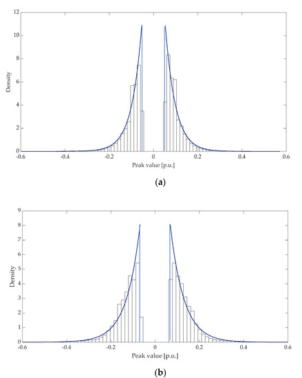 Approximation of the power peak values of the regulation power to a Laplace pdf in Case 2 (a) and Case 3 (b).