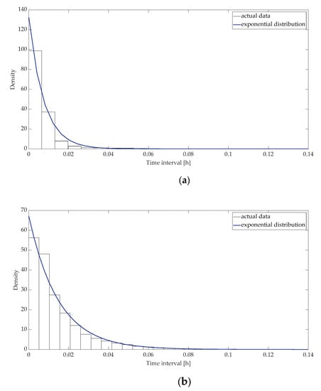 Regarding the time of occurrence of the regulation power, the analysis of the actual values is reported in Figure 17. In particular, Figure 17a refers to Case 2 and Figure 17b refers to the Case 3. These data are collected in terms of frequency of occurrence whose histograms are reported in the figure together with the fitting exponential distribution which provides an accurate approximation of the real distribution.