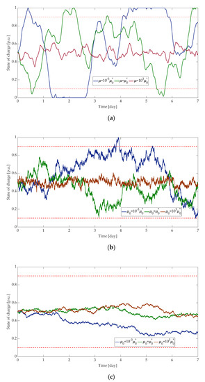 Various simulations have been performed for deriving different SoC profiles corresponding to the three case studies defined in the previous sub-sections, which refer to the different dead-bands. Regarding the gain parameter , the value estimated in Section 4 has been initially considered (). The effect of two further values have also been investigated, which are and . The SoC profiles obtained for each gain parameter are reported in Figure 18 for each case study: Figure 18a refers to Case 1, Figure 18b refers to Case 2, and Figure 18c refers to Case 3.