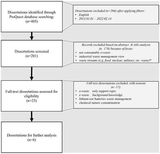 In the studies’ eligibility assessment (full-text reading), around 75% (17) of dissertations were rejected. The reason for rejection was that in the rejected studies, e-waste was still a side topic (not the main research focus area). In these studies, e-waste was mentioned only a couple of times, as a piece of background knowledge. Additionally, dissertations about degradation and biodegradation of batteries and chemical contaminations from lithium-ion batteries pyrolysis were also excluded, as these did not focus on the issue of consumable e-waste. Finally, six dissertations were selected to be consistent with the selected research objective.