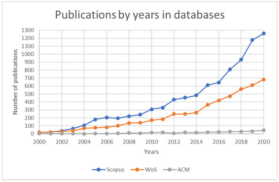 In summary, to be able to study the current situation of e-waste topic-related dissertations statuses in an academic doctoral studies context, several rounds of searches were run in various academic databases. These databases include, e.g., Scopus, Web of Science Core Collection, and ACM—Association for Computing Machinery databases. For the test search, the same set of keywords was utilized for all databases. The keywords utilized are presented in Table 2. The interest was given to the number of publications in these databases and the number of publications per year, to evaluate the growth of the academic output. The studies selected for investigation were limited to dissertations, which were published using the English language; in addition, results from all years were compared to results starting from the year 2000. We were mainly interested to discover e-waste-related research statuses (not only doctoral dissertations but in general). Table 6 depicts the total number of findings in this comparison search.