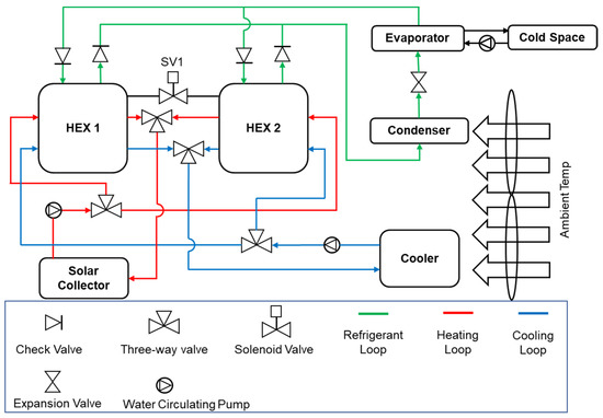 The full layout of the proposed system is illustrated in Figure 1. The green, blue, and red loops represent the refrigerant, cooling, and heating loops, respectively. The condenser and cooler are under air flow at ambient temperature, which determines their operating temperatures. The thermal energy is transferred from the solar collector to the beds through the heating loop during heating. In the refrigerant loop, as the refrigerant evaporates and absorbs heat in the evaporator, heat is taken away from the cold space to produce the cooling effect. The solenoid valve (SV1) between the two beds allows for refrigerant mass transfer (a process that improves both COP and cooling power). The mass transfer between the two beds takes place at the end of each half cycle.