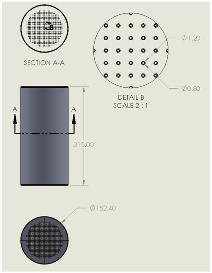 A CAD drawing of the MT-HEX was made using SOLIDWORKS@ in Figure 2, with the dimensions in mm. The shell is made of stainless steel (SS 316) with a length of 315 mm, an outer diameter (OD) of 152.4 mm, and a thickness of 1.63 mm (standard pipe size). The two lids on both sides of the tube have an OD of 152.4 mm and a thickness of 2 mm. There are 800 micro-tubes with an OD of 1.2 mm, an inner diameter (ID) of 0.8 mm, and a length of 315 mm within the outer tube. The micro-tubes also extend through the tube end plates for water manifold connection. The HTF is pumped through the micro-tubes to heat/cool the carbon during desorption/adsorption. The space within the shell between the micro-tubes is filled with compacted SRD1352/3 activated carbon from Chemviron Carbon Ltd.