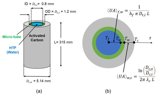For simplicity, the compacted activated carbon is assumed to form a cylinder-like shape around each micro-tube, as illustrated in Figure 3. The estimations of the carbon thickness around each micro-tube , as well as the overall heat transfer coefficient (UA) values, are based on this assumption. Further assumptions are the unidirectional heat flow (radially), longitudinally uniform temperature of the activated carbon bed, and fully developed flow of HTF inside the micro-tube.