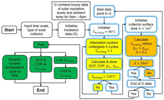 The flowchart of the algorithm for the solar-driven adsorption air conditioning model is shown in Figure 4 [10]: the yellow and orange boxes represent nested loops within the blue outline loop, while the green boxes are the plots generated by the model.
