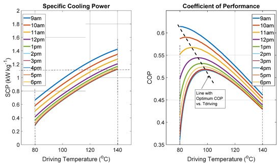 Figure 5 shows the predicted key performance indicators (KPIs) of the adsorption air conditioning system with the described thermal compressor. The SCP increases linearly with the driving temperature and ranges between 0.3 kW kg−1 and 1.4 kW kg−1, regardless of the time of the day. Similarly, the COP ranges between 0.35 and 0.65, but with optimal values when the driving temperatures range between 80 °C and 90 °C.