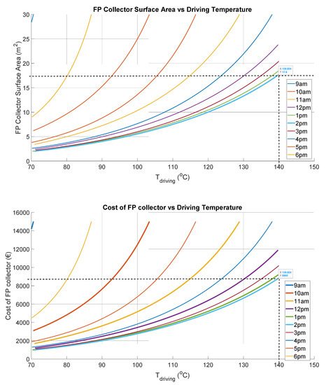 Flat plate solar collector (FPSC) area and cost model predictions for function of driving temperature.