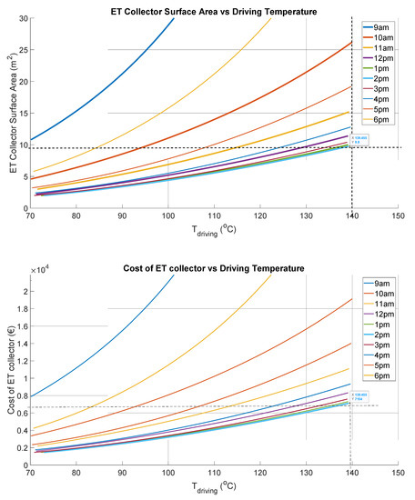 Evacuated tube solar collector (ETSC) area and cost model predictions for function of driving temperature.