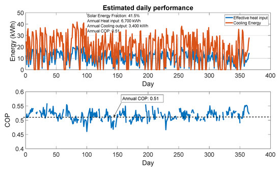 The performance of the air conditioning system on the hottest day is shown in Table 6: both cooling capacity (between 1 kW and 2.6 kW) and COP (between 0.43 and 0.58) are well within the nominal design performance. This means there is a daily cooling energy production of 20 kWh from 41 kWh daily useful heat input, and the COP on this day is about 0.50. Furthermore, the annual cooling energy production is about 3400 kWh, and the annual solar heat input 6700 kWh, giving a seasonal COP of about 0.51. Figure 8 shows the cooling energy production and corresponding COP for each day of the year. The machine will obviously not operate every day (there are a few days with total cloud cover) or for the entire 24-h day without some form of storage. As shown in Figure 9, the typical cooling production period is only between 10:00 am and 4:00 pm. To remedy this, the evaporator will have two compartments: a chiller section for air conditioning and an ice bank section (Tevap = −5 °C). The ice is produced and stored when the cooling demand is low during the day. This ice bank could then be used for night cooling demand or daily cooling demand as a top-up, or during periods of low insolation (typically below 300 W m−2).