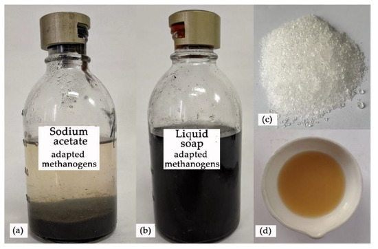 The methanogenic fermentation (13 days) of sodium acetate (a) and model soapstock (b), as well as sodium acetate crystals (c) and liquid soap (d), which were added to fermentation jars to prepare model stocks.