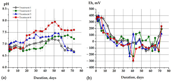 In all variants of the experiment, the redox potential was gradually decreased to negative values, and were more optimal for methanogens. The maximum decrease in redox potential was observed via the model soapstock fermentation with an adapted methanogenic microbial community (Figure 2b, treatment 4). Thus, Eh decreased from +345 ± 23 mV to −294 ± 29.4 mV. For a long time, Eh remained low and only from 69 to 72 days increased from −132 ± 33.2 mV to +236 ± 53.6 mV, respectively. That indicated the inhibition of the metabolic activity of methanogens (Figure 2b, treatment 4). The Eh did not decrease below −226 ± 45 mV (37 days), but the dynamics and the values of redox potential from 44 to 72 days in both variants were similar during the fermentation of the model soapstock with non-adapted methanogens (Figure 2b, treatments 3, 4). The redox potential had a maximum decreased after 41 days from 389 ± 19.5 mV to −224 ± 41.2 mV, but increased to +116 ± 15.8 mV after 44 days during the fermentation of sodium acetate with adapted methanogens (Figure 2b, treatment 2). Non-adapted methanogens were able to decrease Eh only to −144 mV for 55 days of cultivation, after which it gradually increased to +201 ± 22 mV (Figure 2b, treatment 1). A decrease in the Eh to extremely negative values during the growth of methanogens indicated their high metabolic activity and correlated with an increase in the methane synthesis.