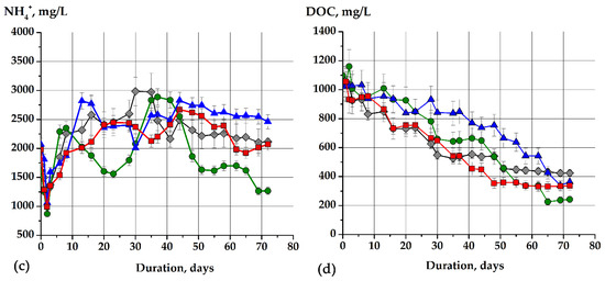 Thus, the initial pH in all variants of the experiment ranged from 6.72 ± 0.2 to 6.92 ± 0.3 (Figure 2a). In both cases with sodium acetate (treatment 1, treatment 2), the pH increased slowly for the first 20 days. Subsequently (from 28 to 72 days), the pH was stabilized close to the neutral zone from 7.0 ± 0.1 to 7.4 ± 0.1 using both types of inoculum for fermentation (Figure 2a). The pH dynamics of the model soapstock fermentation containing long-chain fatty acids differed from the fermentation of the short-chain fatty acids of sodium acetate. The pH began to rise slowly on the second day of cultivation and increased from 6.8 ± 0.3 (start of fermentation) to 7.1 ± 0.2 (2 days) during the fermentation with adapted methanogens (Figure 2a, treatment 3). The maximum pH value was 7.5 ± 0.2 (51 days). Subsequently, the pH was decreased to slightly acidic values of 6.65 ± 0.2. In contrast to those that were unadapted, adapted methanogens (Figure 2a, treatment 4) raised the pH to a maximum of 7.9 ± 0.4 at 51 days of cultivation. Subsequently, they maintained a pH at a high level of not less than 7.6 ± 0.2 (Figure 2a, treatment 4). The increase in pH from the 20th to the 50th day of cultivation in all variants of the experiment (most in treatment 4, adapted methanogens) can be explained by the accumulation of ammonium ions (Figure 2d) due to the microbial degradation of nitrogen-containing compounds (biomass of microorganisms or stock components (proteins and amino acids) that were introduced into the jars together with the inoculum). Thus, the autoregulation of pH to the slightly alkaline value, which is more optimal for methanogens, was observed.