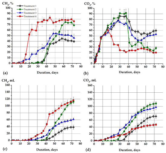 The production of biogas from sodium acetate and the model soapstock during microbial purification: concentration of CH4 (a), concentration of CO2 (b), cumulative production of CH4 (c), cumulative production of CO2 (d). The figure shows the dynamics of biogas production in different variants with sodium acetate and non-adapted methanogens (gray lines, treatment 1), sodium acetate with adapted methanogens (green lines, treatment 2), model soapstock as a substrate and non-adapted methanogens (blue lines, treatment 3), model soapstock as a substrate and adapted methanogens (red lines, treatment 4).