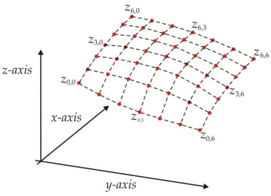 Thus, the flat surface provides the coordinates (z0,0, z1,0, …, zn,m) in the z-axis, where the sub-indices (n, m) represent the number of coordinates in the x-axis and y-axis, respectively. Thus, the flat surface model is deduced by the next plane expression