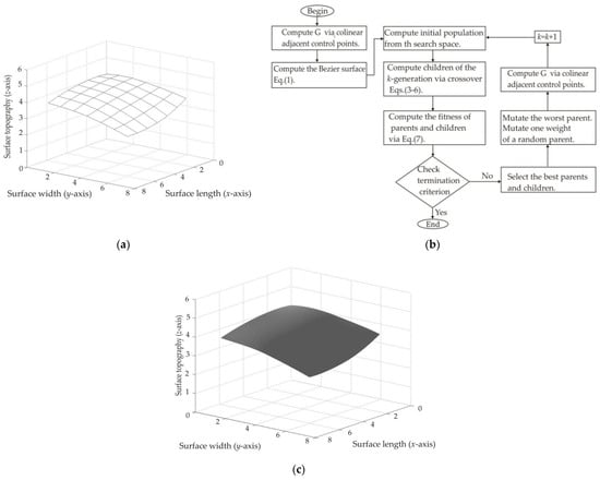 The fifth step is to perform the mutation, which leads to avoiding trapping in a local minimum. To carry it out, a new parent is randomly generated from the search space. Then, the new parent replaces the worst parent, which is selected by means of the fitness Equation (14). Thus, if the new parent improves the fitness, the worst parent is replaced by the new parent. Otherwise, the worst parent is not mutated. Additionally, one constant is mutated from a parent, which is selected in random form. To do so, a new constant is randomly generated from the solution space, and it is replaced in the selected parent to compute the fitness via Equation (14). If the new constant improves the fitness, the mutation is carried out; if not, the constant is not mutated. Thus, the mutation is accomplished to determine the parents of the (k + 1) generation. Then, the children of the (k + 1) generation are generated through the crossover by computing Equation (3) through Equation (6). Additionally, the fitness of these children is computed via Equation (14). From this step, the population of the (k + 1) generation is completed. Then, the steps to determine the (k + 1) generation are repeated until the multi-objective function in Equation (14) is minimized. After that, the optimal constants (a, b, c) are replaced in Equation (8) to obtain the flat surface model. Thus, the micro-scale flat surface model is generated by the multi-objective optimization through a genetic algorithm.