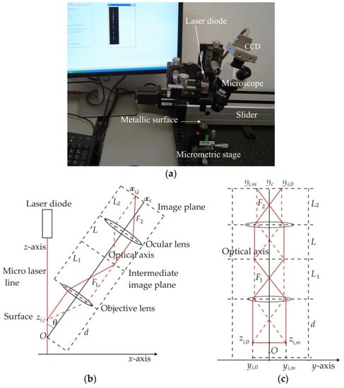 The microscope vision system to perform micro-scale surface contouring is shown in Figure 4a. This arrangement consists of an optical microscope, which includes a laser CCD camera, a diode, and a computer. This microscope system is mounted on a slider device to perform the micro laser scanning. In this arrangement, the surface plane is located on the x-axis and y-axis, and the surface contour is parallel to the z-axis. The lateral view of the microscope arrangement in the x-axis is described by the optical geometry shown in Figure 4b, where a 38 μm laser line is projected perpendicularly on the target surface and the microscope is aligned at an angle. The symbol θ depicts the angle between the optical axis and the laser line. The distance between the surface and the objective lens is defined by d. The objective focal length and the objective focus are represented by L1 and F1, respectively. The distance between the ocular lens and the intermediate image plane is represented by L. The ocular focal length and the ocular focus are represented L2 and F2, respectively. The lateral view of the microscope arrangement in the y-axis is described by the optical geometry shown in Figure 4c. The laser line coordinates in the image plane are represented by (xi,j, yi,j) in the x-axis and y-axis, respectively. The image center is represented by the coordinates (xc, yc), and the pixel size is represented by η. The topography coordinates yi,j and zi,j are deduced from the geometry shown in Figure 4b,c by means of the expressions