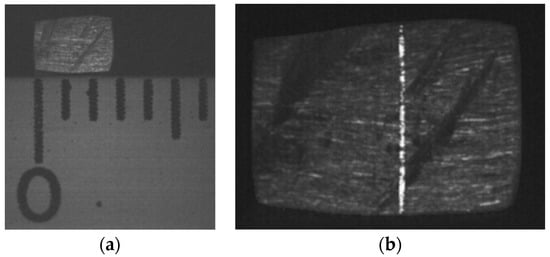 (a) Metallic object surface with scale in mm in x-axis. (b) Micro laser line projected on the object surface.