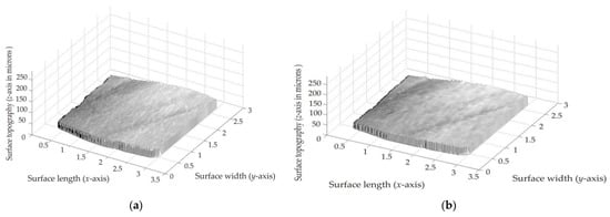 The running time is defined by the number of generations. In this case, 157 generations were computed to optimize the micro-scale flat surface model. In this way, the micro-scale flat surface modeling was performed through multi-objective optimization. The efficiency of the multi-objective optimization is described through the parameters in the genetic algorithm as follows. The population size is determined through the constants (a, b, c). For each constant, an initial population of twelve chromosomes was generated. Therefore, one generation included a population of 36 chromosomes. The crossover probability determines how often the crossover is performed. When the average fitness of the parents is improved, the crossover is carried out. In this way, the multi-objective optimization is performed several times on the same flat surface model. The result of the probability of crossover was in the interval from 0.21 to 0.55. The mutation probability determines how often the chromosome can be mutated. Thus, if the new parent improves the fitness, the worst parent is mutated. In the same way, for the parameter mutation, if the new parameter improves the fitness, the parameter is mutated. Thus, the multi-objective optimization is performed several times on the same flat surface model. The result of the probability of mutation was in the interval from 0.26 to 0.53. The number of generations indicates the number of the iterations to obtain the optimal constants. In this case, 157 generations were performed to accomplish the flat surface model. The optimal gap was computed via Equation (22), and the result was a relative error of 1.231%. Based on these results, the genetic algorithm was examined. In this case, the genetic provided good crossover probability and mutation probability. It is because the probability was in the interval established in the surface modeling optimization. The population size is related to the convergence and the number of parameters. In this case, the genetic algorithm provided 12 chromosomes for each parameter. These chromosomes produced results near the optimal solution and reduced iterations. Therefore, the algorithm provided a good population size and number of iterations. The optimal gap established good fitting of the surface model to the target surface.