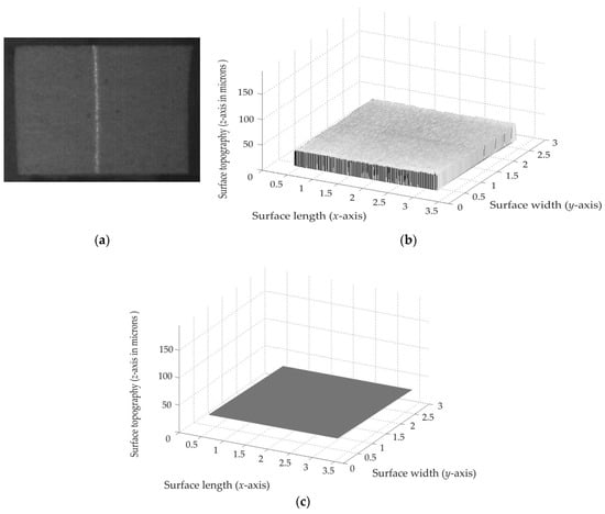 (a) Micro laser line projected on flat surface to perform micro-scale flat surface modeling. (b) Micro-scale surface retrieved via micro laser line scanning. (c) Surface computed by the flat surface model generated via Equation (8).