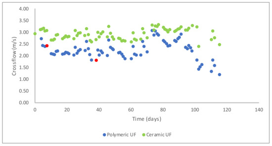 Crossflow achieved in each UF line at similar recirculation flow. The red dots indicate the membrane changeovers on the polymeric UF line.