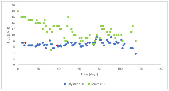 Flux of the Polymeric UF and the Ceramic UF. The red dots indicate the membrane changeovers on the polymeric UF line.