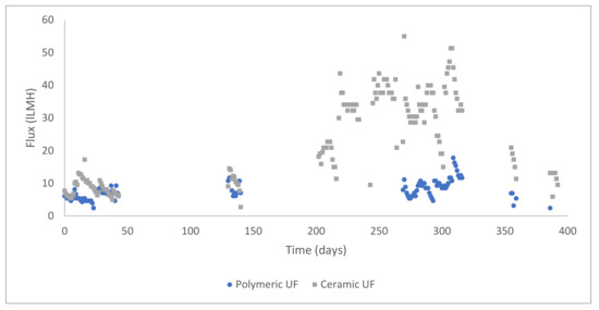 The net permeate flow was found comparable for both systems, as shown in Figure 2, although, the installed area (22 m2) of the Ceramic membranes was significantly lower compared to the polymeric ones (54 m2). As stated before, the red dot symbol indicates the membrane changeovers for CIPs. This results in a much higher flux for the Ceramic UF when compared to the Polymeric UF membranes, as can be observed in Figure 3.