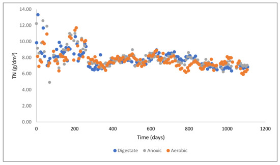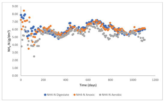 The ammonium nitrogen concentration (Figure 6) exhibited a similar trend to the TN values and was also affected by the seasonal changes in the AD feedstock. From day 680, it is clear that the nitrification stage showed some enhanced operation, which was the result of internal recirculation between the anoxic to anaerobic digester that took place. The convergence observed at a later stage, a deterioration on the nitrification process, was the result of a series of technical problems in the air distribution pipeline in the aeration tank. After successful replacement, the operation was restored, and the Nitrification process delivered the expected results by removing a fraction of Ammonia. Again, as it was expected, in the last 60 days of operation, NH4-N was decreased in the aerobic tank from 5.97 ± 0.14 to 4.91 ± 0.35 g/dm3, signifying a 17.6% removal.