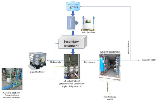 The concentrate of the UF system was recycled to the Secondary Biological Treatment stage, while a fraction was used for the production and stabilization of the Liquid fertilizer.